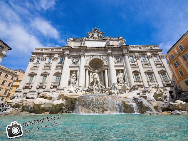 許願池,原名是特雷維噴泉(Fontana di Trevi)。中央是駕駛戰車的海神波塞頓,海神宮的中間是駕馭飛馬戰車的海神,左右側則是豐裕與健康女神,海神的下方則是海之信使特裡同。