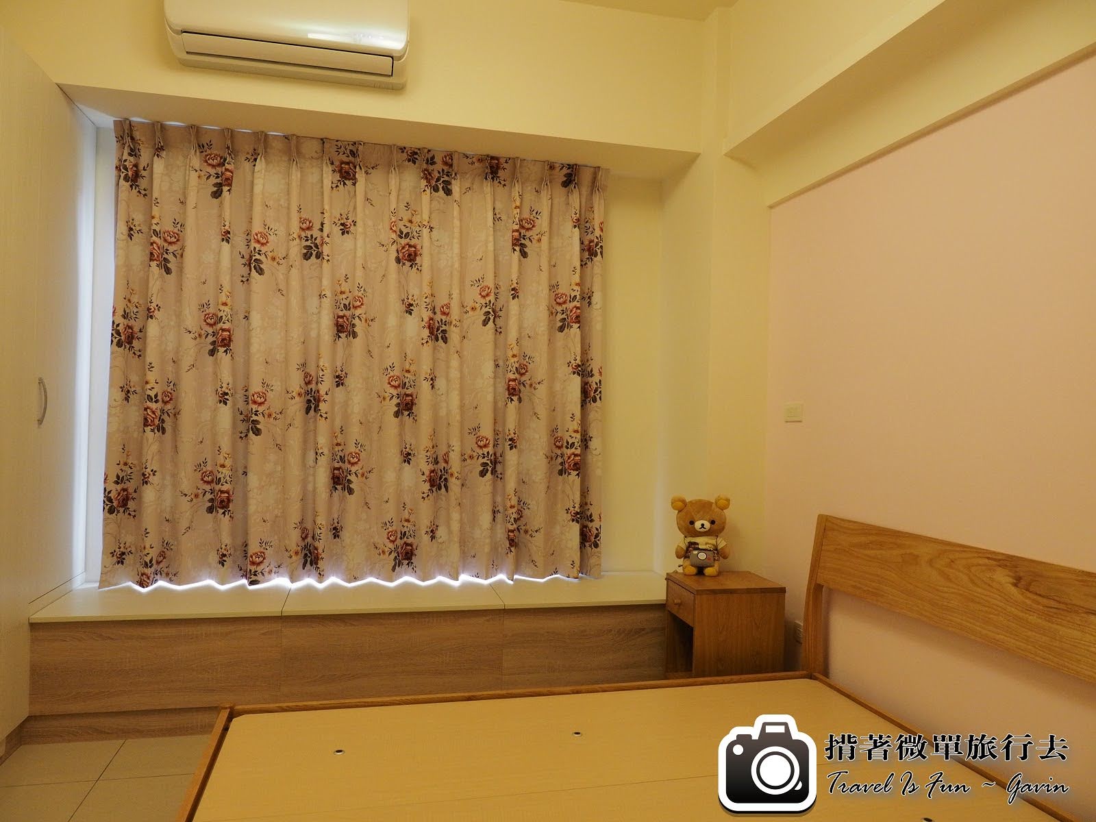 拉上窗簾之後,光線明顯進不來,遮光的效果真的很好。花色也很配合房間的風格與色調。感謝法布的師傅,為了不影響收納櫃的使用,軌道的部份剛好在窗戶的邊緣多一點點,以便讓門板可以開啟的角度更大。真的很謝謝他們。